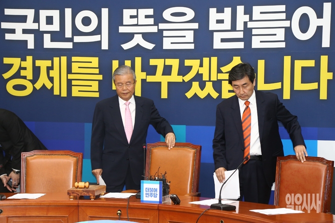 27일 오전 서울 여의도 국회에서 열린 더불어민주당 비상대책위원회의에 김종인 비대위 대표와 이종걸 원내대표가 입장하고 있다.