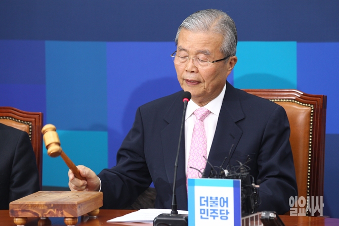 27일 오전 서울 여의도 국회에서 열린 더불어민주당 비상대책위원회의에서 김종인 비대위 대표가 의사봉을 두드리고 있다.