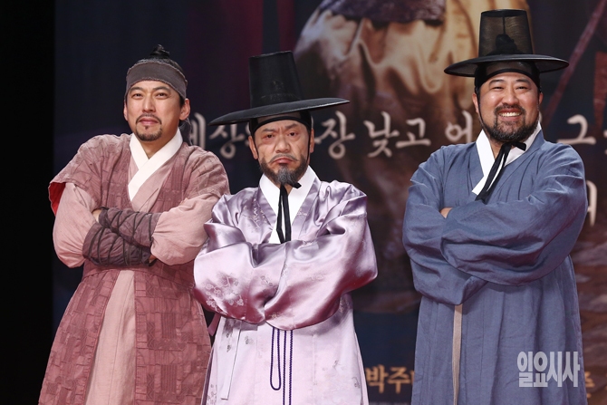 27일 오후 서울 마포구 상암 MBC 미디어센터에서 열린 MBC 새 주말드라마 <옥중화>의 제작발표회에서 배우 김형범, 이희도, 위양호가 포토타임을 갖고 있다.