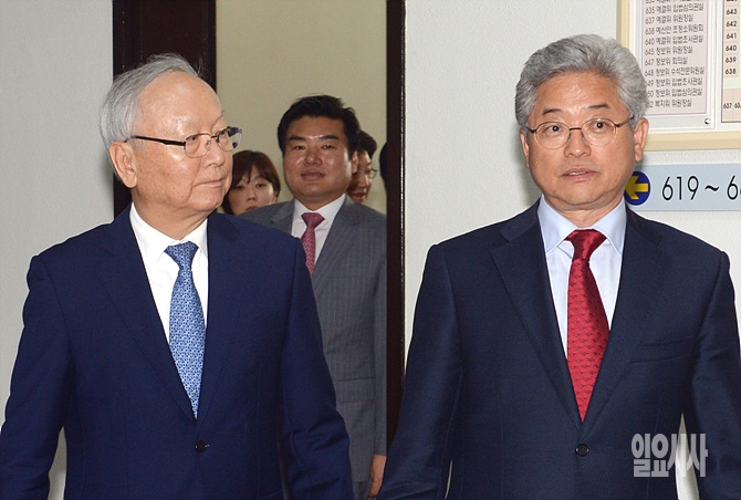 27일, 이병호 국가정보원장(사진 왼쪽)이 북한의 제5차 핵실험 가능성과 북한의 잠수함 발사 탄도미사일(SLBM) 시험 발사, 5월초로 예정된 제7차 노동당대회 등 북한 관련 동향과 정보를 보고하기 위해 열린 국회 정보위원회 간담회에 앞서 이철우(오른쪽)·신경민 여야 간사, 원유철 새누리당 원내대표 등과 환담을 나누기 위해 서울 여의도 국회 정보위원장실 안으로 입장하고 있다.