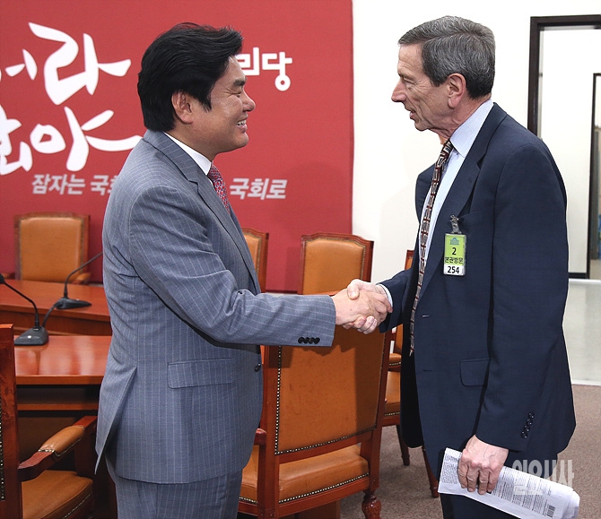 원유철 새누리당 원내대표 권한대행(사진 오른쪽)이 27일, 서울 여의도 국회를 방문한 로버트 아인혼 전 미국 국무부 차관보와 환담 전, 악수를 나누고 있다.