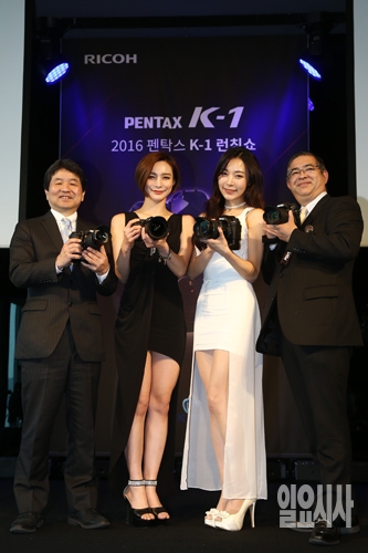 28일 오전 서울 한강 잠원지구 프라디아 컨벤션에서 열린 사진영상장비 전문기업 세기P&C의 펜탁스 첫 풀프레임 DSLR 카메라 'K-1' 런칭 행사에서 리코이미징 시노부 타카하시 총괄본부장(왼쪽)과 히라쿠 가와우치 홍보팀 매니저가 포토타임을 갖고 있다.