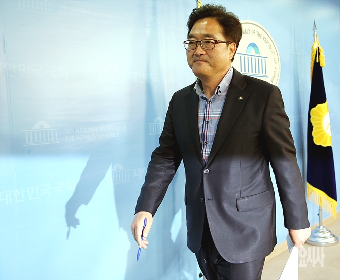29일, 더불어민주당 우원식 의원이 서울 여의도 국회 정론관서 원내대표 출마 기자회견 직후 의미심장한 표정으로 퇴장하고 있다.