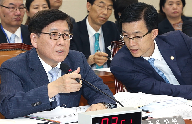 29일, 서울 여의도 국회 보건복지위원회 회의실에서 전체회의가 열린 가운데, 방문규 보건복지부 차관이 정진엽 보건복지부장관에게 보고를 하고 있다.