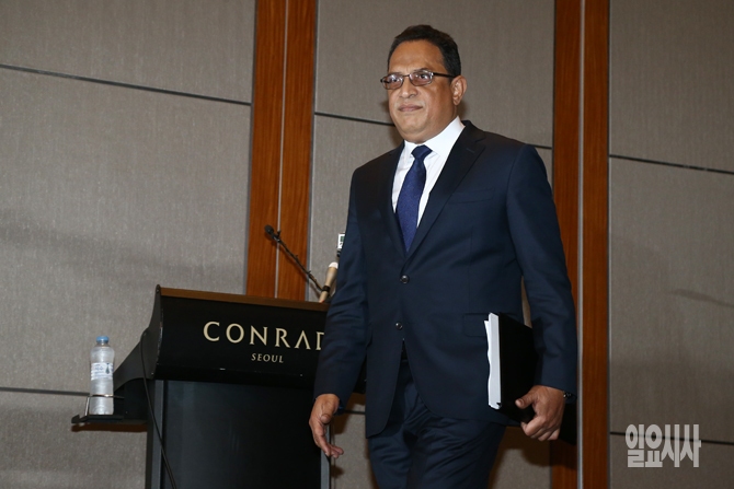 2일 오전 서울 영등포구 콘래드호텔에서 열린 가습기 살균제 관련 입장발표 기자회견에 아타울라시드 사프달 옥시레킷벤키저(현 RB코리아) 대표가 기자회견을 갖기 위해 입장하고 있다.