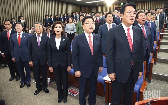 3일, 서울 여의도 국회서 열린 2016 새누리당 원내대표 및 정책위의장 선출 당선자 총회에 앞서 새누리당 의원들이 애국가를 제창하고 있다.