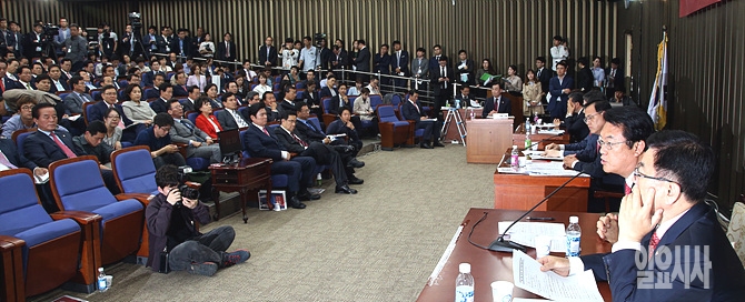 3일, 서울 여의도 국회서 열린 2016 새누리당 원내대표 및 정책위의장 선출 당선자 총회에서 정진석 원내대표 후보자가 정견 발표를 하고 있다.