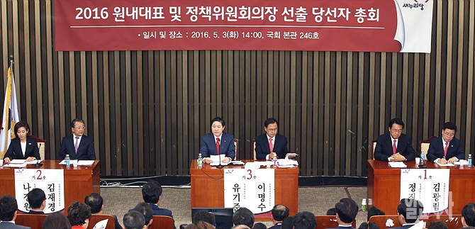 3일, 서울 여의도 국회서 열린 2016 새누리당 원내대표 및 정책위의장 선출 당선자 총회에서 유기준 원내대표 후보자가 정견 발표를 하고 있다.