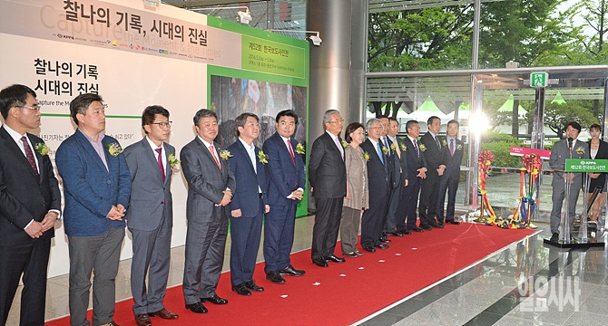 3일, 서울 강남구 코엑스에서 열린 '제 52회 한국보도사진전'에 참석한 새누리당 원유철 원내대표, 김종인 더불어민주당 대표, 국민의당 안철수 공동대표, 정의당 심상정 대표 등 여야 지도부가 참석한 가운데 기념촬영을 갖고 있다. (사진=사진공동취재단)