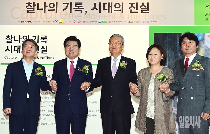 3일, 서울 강남구 코엑스에서 열린 '제52회 한국보도사진전'에 참석한 새누리당 원유철 원내대표(사진 왼쪽서 두 번째), 김종인 더불어민주당 대표(가운데), 국민의당 안철수 공동대표(왼쪽), 정의당 심상정 대표(오른쪽서 두 번째), 이동희 한국사진기자협회장 등이 참석한 가운데 기념촬영을 갖고 있다. (사진=사진공동취재단)