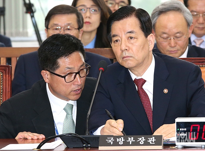 3일, 서울 여의도 국회 국방위원회 회의실서 열린 국방위 전체회의 도중 한민구 국방부장관이 관계자로부터 잠시 보고를 받고 있다.
