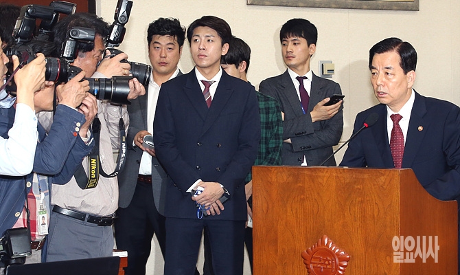 3일, 서울 여의도 국회 국방위원회 회의실서 열린 국방위 전체회의에서 한민구 국방부장관이 업무보고를 하고 있는 가운데 취재진이 열띤 취재경쟁을 벌이고 있다.