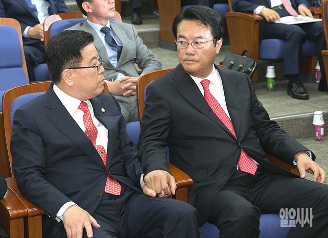 3일, 서울 여의도 국회서 열린 2016 새누리당 원내대표 및 정책위의장 선출 당선자 총회에서 결과가 발표된 직후, 정진석 원내대표 당선인이 러닝메이트로 나선 김광림 정책위의장 당선인의 손을 꼭 잡고 있다.