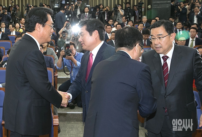 3일, 서울 여의도 국회서 열린 2016 새누리당 원내대표 및 정책위의장 선출 당선자 총회에서 결과가 발표된 직후, 정진석 원내대표 당선인과 러닝메이트로 나선 김광림 정책위의장 당선인이 원유철 원내대표와 김정훈 정책위의장과 악수를 나누고 있다.