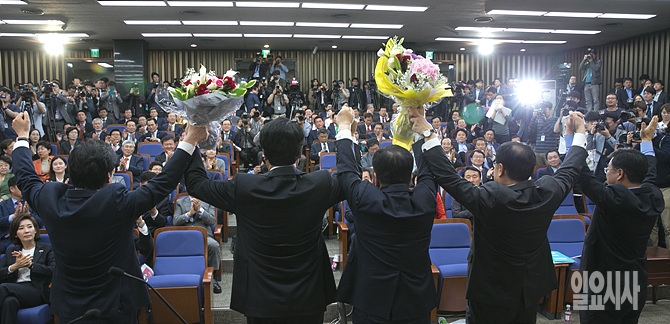 3일, 서울 여의도 국회서 열린 2016 새누리당 원내대표 및 정책위의장 선출 당선자 총회에서 결과가 발표된 직후, 정진석 원내대표 당선인, 김광림 정책위의장 당선인 등 참가자들이 손을 번쩍 들고 있다.