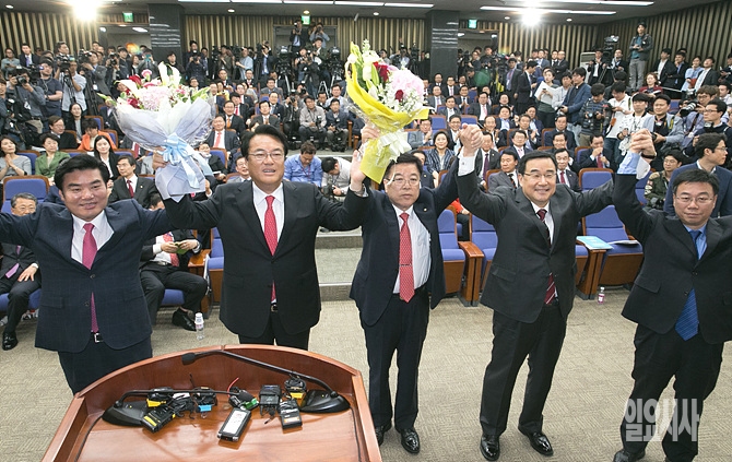 3일, 서울 여의도 국회서 열린 2016 새누리당 원내대표 및 정책위의장 선출 당선자 총회에서 결과가 발표된 직후, 정진석 원내대표 당선인(사진 왼쪽서 두 번째)이 러닝메이트로 나선 김광림 정책위의장 당선인 등과 꽃다발을 번쩍 들고 있다.