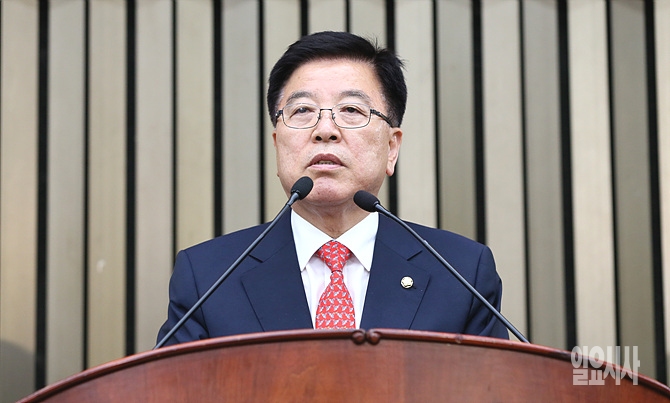 3일, 서울 여의도 국회서 열린 2016 새누리당 원내대표 및 정책위의장 선출 당선자 총회에서 결과가 발표된 직후, 정진석 원내대표 당선인의 러닝메이트로 나선 김광림 정책위의장 당선인이 수락 연설을 하고 있다.