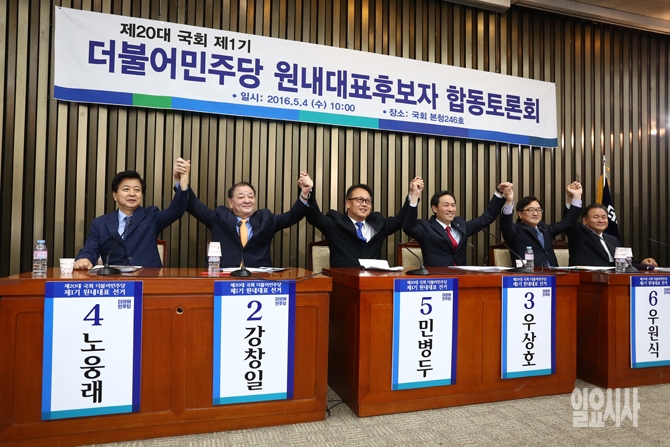 4일 오전 서울 여의도 국회에서 열린 제20대 국회 제1기 더불어민주당 원내대표 선거 합동 토론회에서 원내대표 후보자들이 포토타임을 갖고 있다.