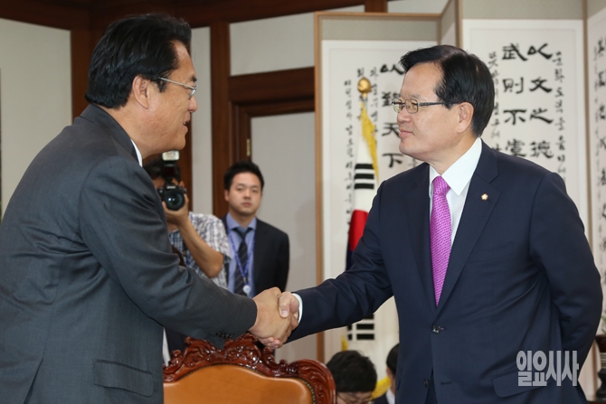 4일 오전 서울 여의도 국회에서 정의화 국회의장을 예방한 새누리당 정진석 원내대표가 악수를 나누고 있다.