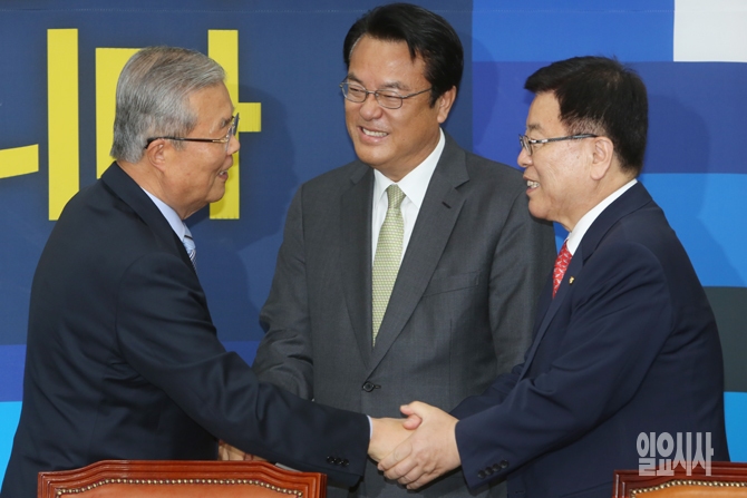 4일 오전 서울 여의도 국회에서 더불어민주당 김종인 비대위 대표를 예방한 새누리당 김광림 정책위의장이 악수를 하고 있다.