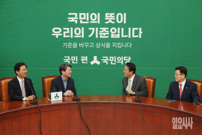 4일 오전 서울 여의도 국회에서 국민의당 안철수, 천정배 공동대표를 예방한 새누리당 정진석 원내대표와 김광림 정책위의장이 대화를 하고 있다.