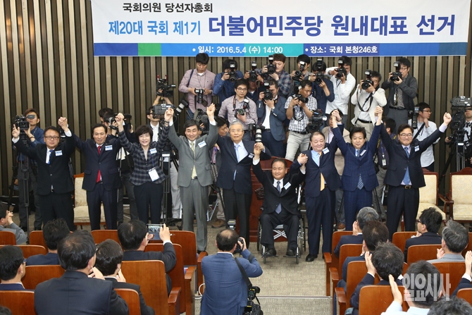 4일 오후 서울 여의도 국회에서 열린 제20대 국회 제1기 더불어민주당 원내대표 선거에서 김종인 비대위 대표, 이종걸 원내대표, 김영주 선거관리위원장과 원내대표 후보자들이 포토타임을 갖고 있다.