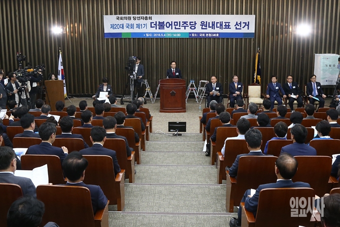 4일 오후 서울 여의도 국회에서 열린 제20대 국회 제1기 더불어민주당 원내대표 선거에서 원내대표 후보자들이 정견발표를 하고 있다.