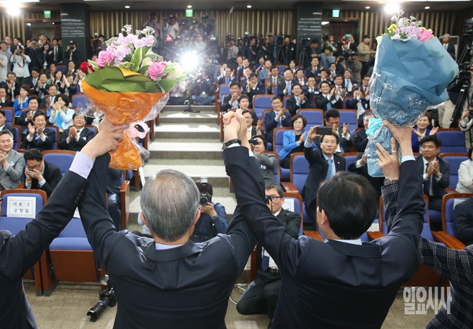우상호 더불어민주당 의원(오른쪽)이 4일 오후 국회에서 새 원내대표로 선출된 뒤 김종인 비대위대표와 꽃다발을 들고 인사하고 있다.