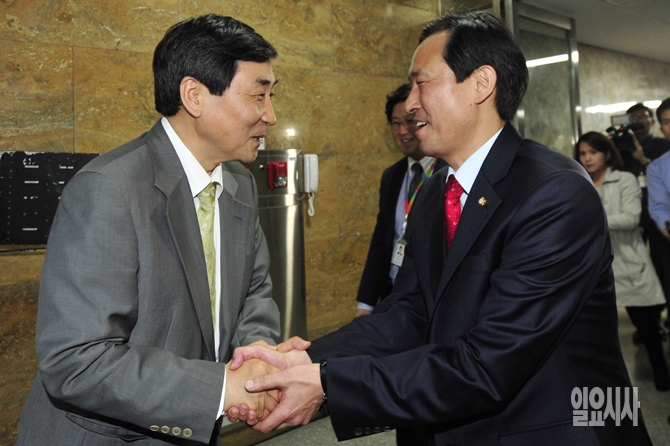 더불어민주당 신임 원내대표로 당선된 우상호 의원이 4일 오후 서울 여의도 국회에서 이종걸 원내대표와 악수를 하고 있다.