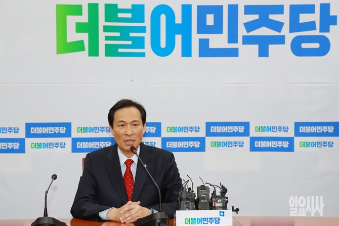 더불어민주당 신임 원내대표로 당선된 우상호 의원이 4일 오후 서울 여의도 국회에서 당선 직후 기자간담회를 갖고 있다.