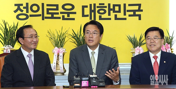 4일, 서울 여의도 국회 정의당 원내대표실을 찾은 새누리당 정진석 신임 원내대표(사진 가운데)와 김광림 정책위의장(오른쪽)이 정의당 노회찬 원내대표와 현안에 대해 이야기를 나누고 있다.
