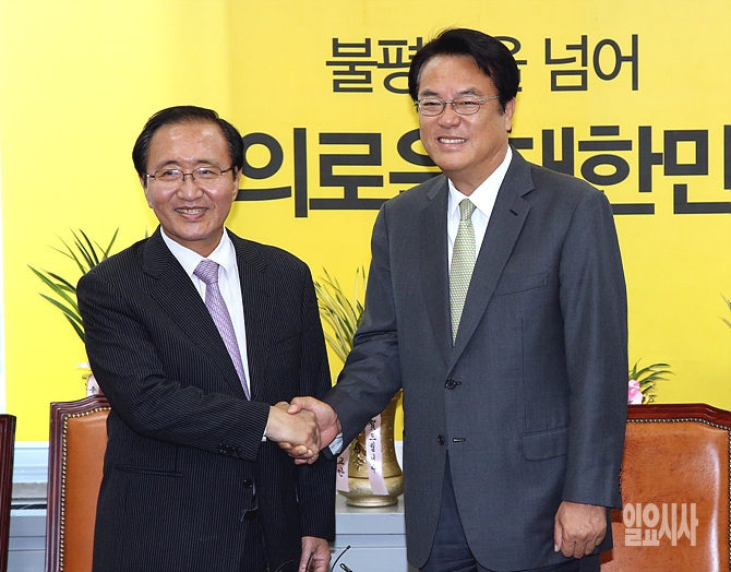 4일, 서울 여의도 국회 정의당 원내대표실을 찾은 새누리당 정진석 신임 원내대표(사진 오른쪽)가 정의당 노회찬 원내대표와 반갑게 악수를 나누고 있다.