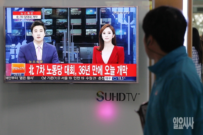 북한이 36년만에 제7회 노동당 대회를 개최한 6일 오전 서울역에서 시민들이 북한 노동당 대회 관련 뉴스를 보고 있다.
