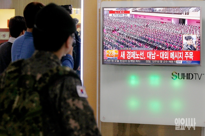 북한이 36년만에 제7회 노동당 대회를 개최한 6일 오전 서울역에서 한 군인이 북한 노동당 대회 관련 뉴스를 보고 있다.