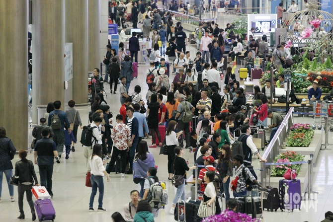 6일 오후 인천국제공항 입국장이 한국을 찾은 여행객들로 붐비고 있다.