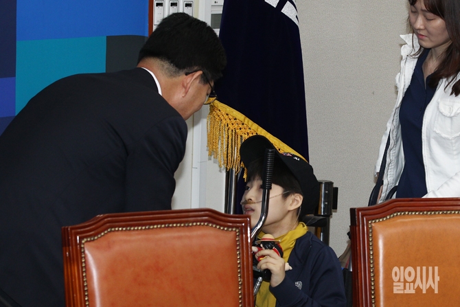 9일 오전 서울 여의도 국회에서 열린 더불어민주당 가습기살균제대책특위 1차 회의 및 피해자 의견청취에서 특위 위원장인 양승조 더불어민주당 의원이 가습기살균제 피해자 임성준군과 인사를 하고 있다.