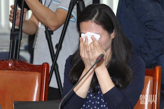 9일 오전 서울 여의도 국회에서 열린 더불어민주당 가습기살균제대책특위 1차 회의 및 피해자 의견청취에서 가습기살균제 피해 가족이 슬픔에 잠겨 있다.