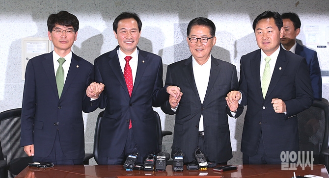 9일, 서울 여의도 국회서 우상호 더불어민주당 신임 원내대표(사진 왼쪽서 두 번째)·박완주 원내수석부대표가 국민의당 박지원 원내대표(왼쪽서 세 번째)·김관영 원내수석부대표 예방에서 손을 맞잡고 있다.