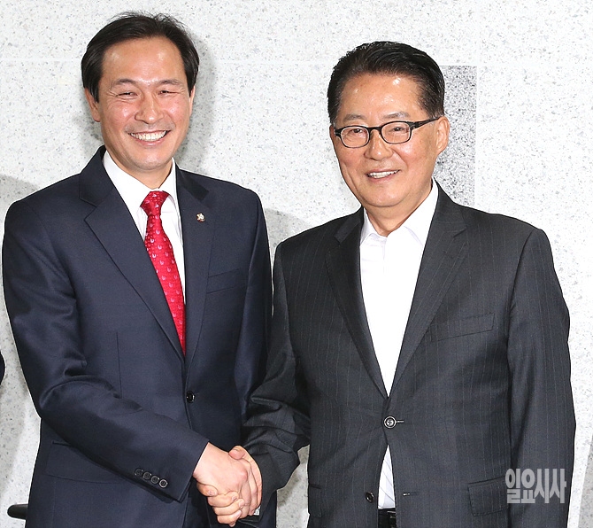 9일, 서울 여의도 국회서 우상호 더불어민주당 신임 원내대표(사진 왼쪽)가 국민의당 박지원 원내대표를 예방한 가운데, 서로 악수를 나누고 있다.