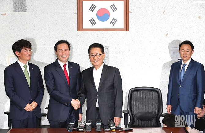 9일, 서울 여의도 국회서 우상호 더불어민주당 신임 원내대표(사진 왼쪽서 두 번째)가 국민의당 박지원 원내대표를 예방한 자리에서 박 원내대표와 웃으며 악수를 나누고 있다.