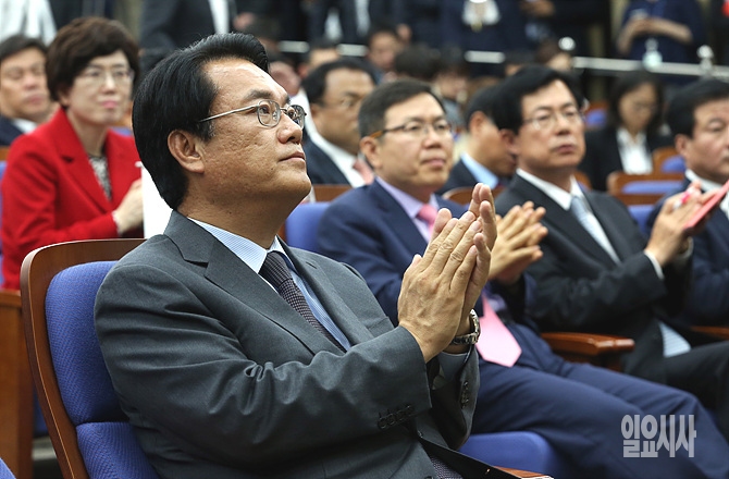 9일, 서울 여의도 국회서 20대 국회 새누리당 당선자 총회가 열린 가운데 정진석 신임 원내대표가 박수를 치고 있다.