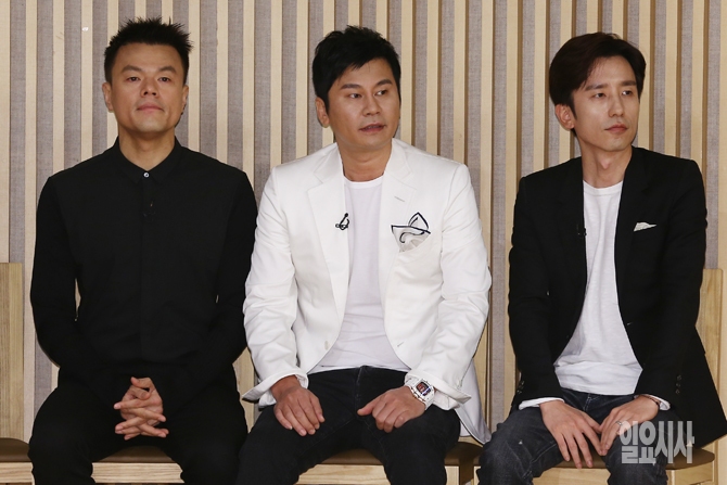 9일 오후 서울 양천구 SBS목동사옥에서 열린 SBS K팝스타 시즌6 제작발표회에서 K팝스타6 심사위원 박진영, 양현석, 유희열이 나란히 앉아 있다.