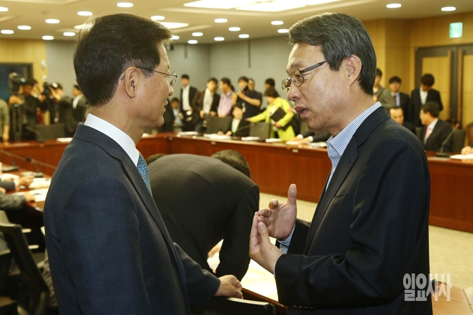 10일 오전 서울 여의도 국회에서 열린 국민의당 당선자 총회에서 국민의당 천정배 공동대표와 김성식 정책위의장이 대화를 하고 있다.