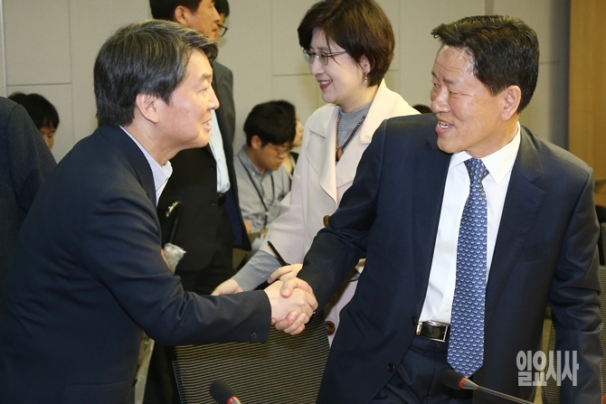 10일 오전 서울 여의도 국회에서 열린 국민의당 당선자 총회에서 국민의당 안철수 공동대표와 주승용 전 원내대표가 악수를 하고 있다.