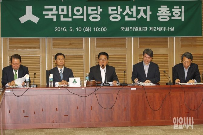 10일 오전 서울 여의도 국회에서 열린 국민의당 당선자 총회에서 국민의당 안철수, 천정배 공동대표와 박지원 원내대표 등 당 지도부가 나란히 앉아 있다.