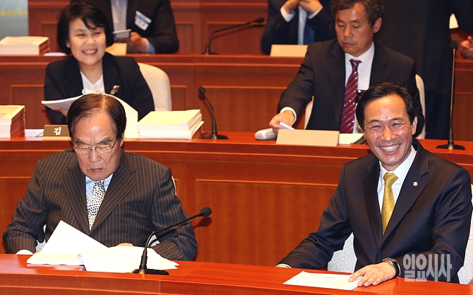 10일, 서울 여의도 국회 예결위원회 회의장서 열린 더불어민주당 초선 의원 연찬회 도중 우상호 원내대표가 활짝 웃음 짓고 있다.