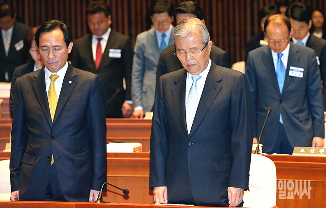 10일, 서울 여의도 국회 예결위원회 회의장서 열린 더불어민주당 초선 의원 연찬회에 앞서 김종인 비대위 대표(사진 오른쪽)와 우상호 원내대표 등 참석자들이 순국선열에 대해 잠시 묵념을 하고 있다.