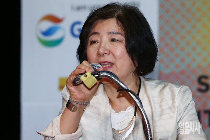 10일 오후 서울 서대문구 한국방송예술교육진흥원 아트홀서 열린 제18회 서울국제여성영화제 공식 기자회견서 이혜경 명예집행위원장이 인사말을 하고 있다.