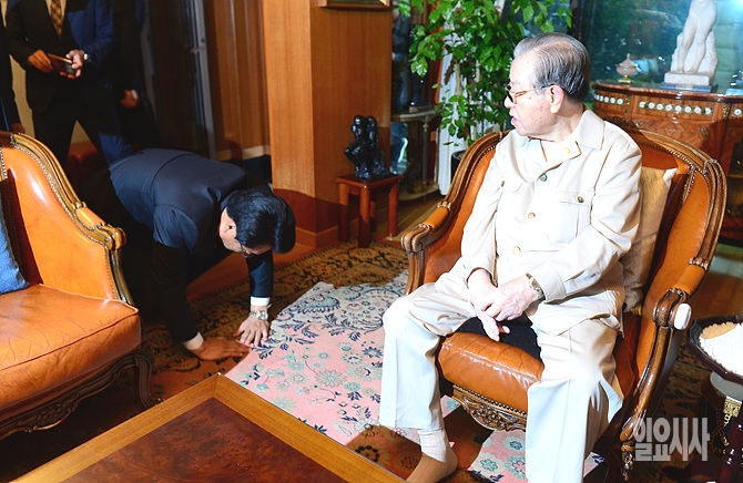 10일, 새누리당 정진석 원내대표가 서울 중구 소재의 김종필 전 국무총리 자택을 예방해 큰절로 인사를 하고 있다.