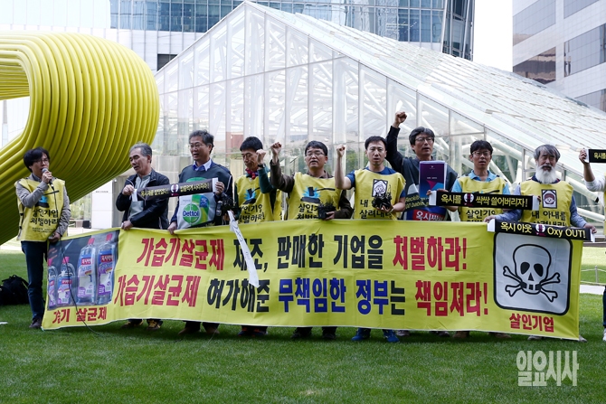 11일 오후 서울 여의도 옥시레킷벤키저(현 RB코리아) 본사 앞에서 가진 영국 옥시 본사를 항의 방문했던 가습기 살균제 피해자 대표단과 환경단체 관계자의 기자회견에서 항의방문단과 환경단체 관계자들이 구호를 외치고 있다.